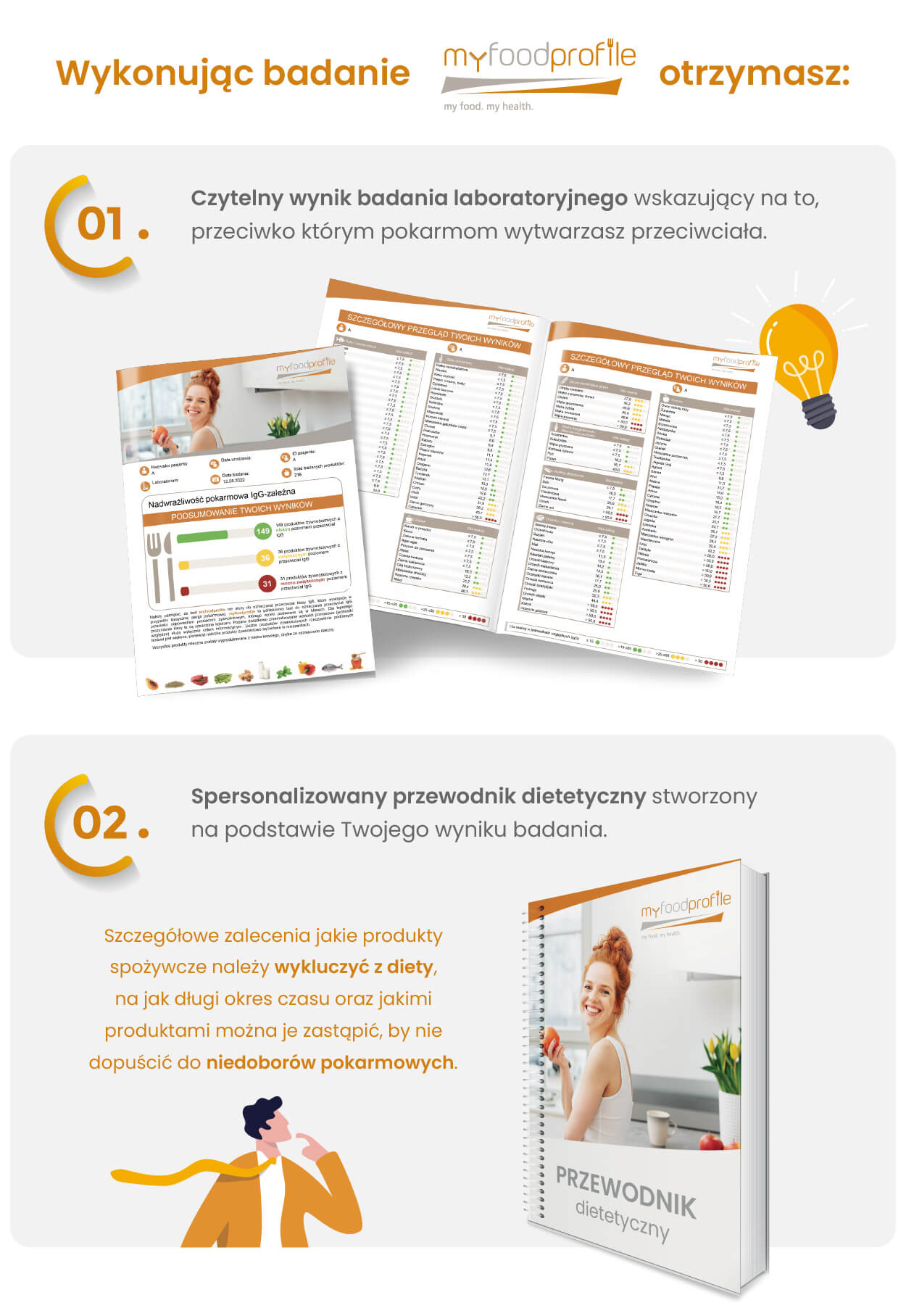 - Spersonalizowany przewodnik dietetyczny: zawiera kilkadziesiąt stron z praktycznymi zaleceniami żywieniowymi przygotowanymi na podstawie wyników uzyskanych w teście, opis wartości odżywczych i listę źródeł produktów, wobec których stwierdzono reaktywność IgG, oraz szablony i tabele ułatwiające prowadzenie diety eliminacyjno-rotacyjnej